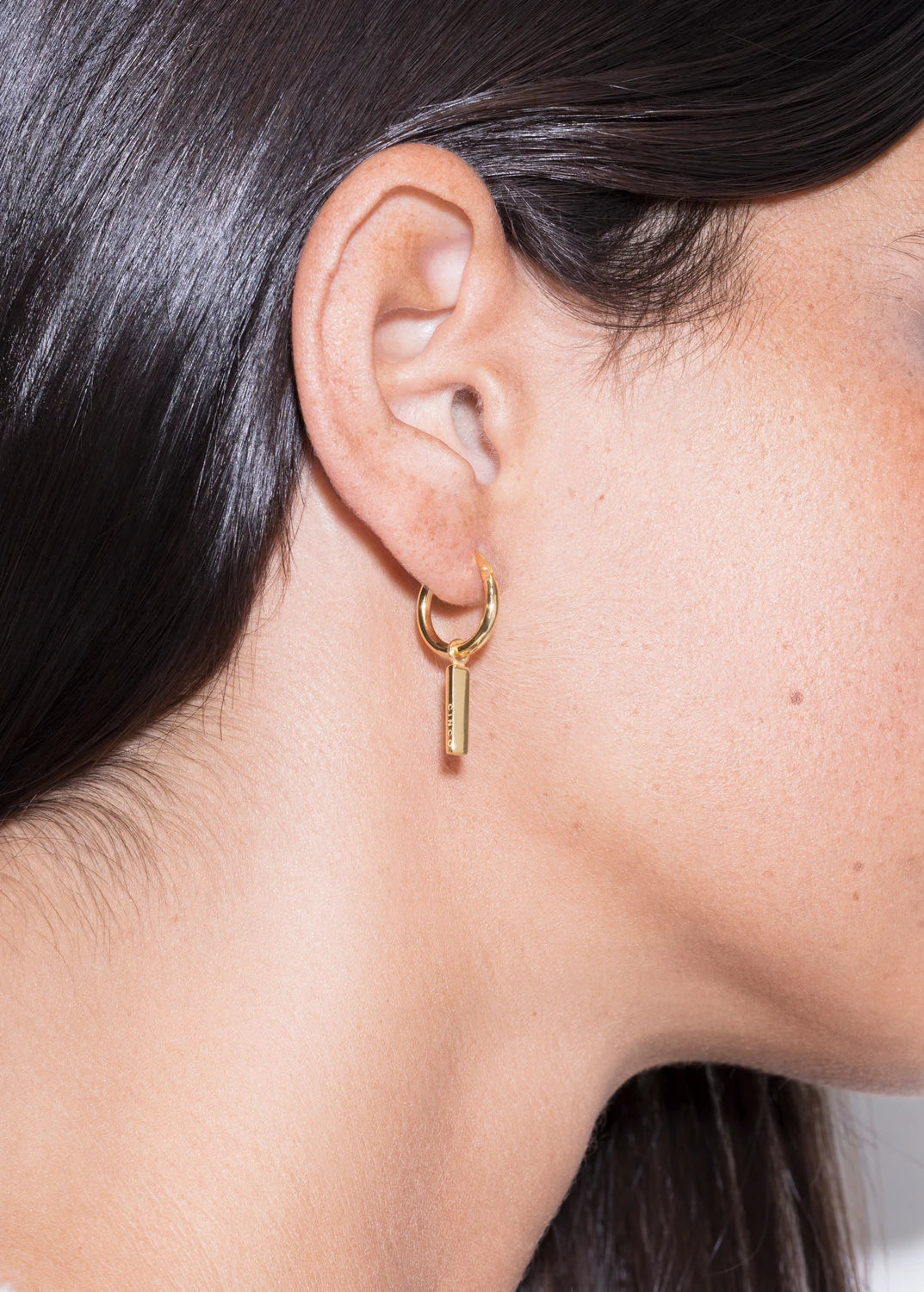 Bela Huggies — simplicity that moves with you. Crafted in Sterling Silver 925, finished in white rhodium or 24k yellow gold plating, these earrings reinterpret the classic huggie with a minimalist vertical charm engraved with CINCO’s signature precision.