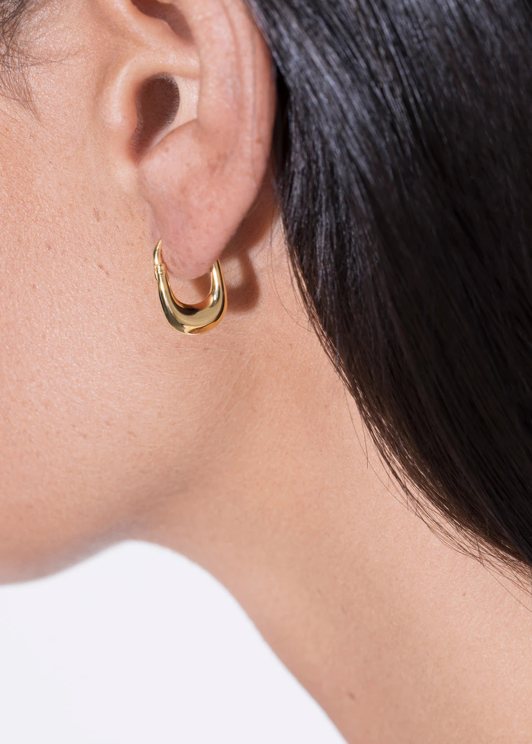 Their smooth, organic form hugs the ear perfectly, reflecting light with a subtle yet confident shine. Designed to evoke a sense of modern serenity, the Sabina Huggies bridge minimalism and sensuality — refined enough for every day, striking enough to stand alone.