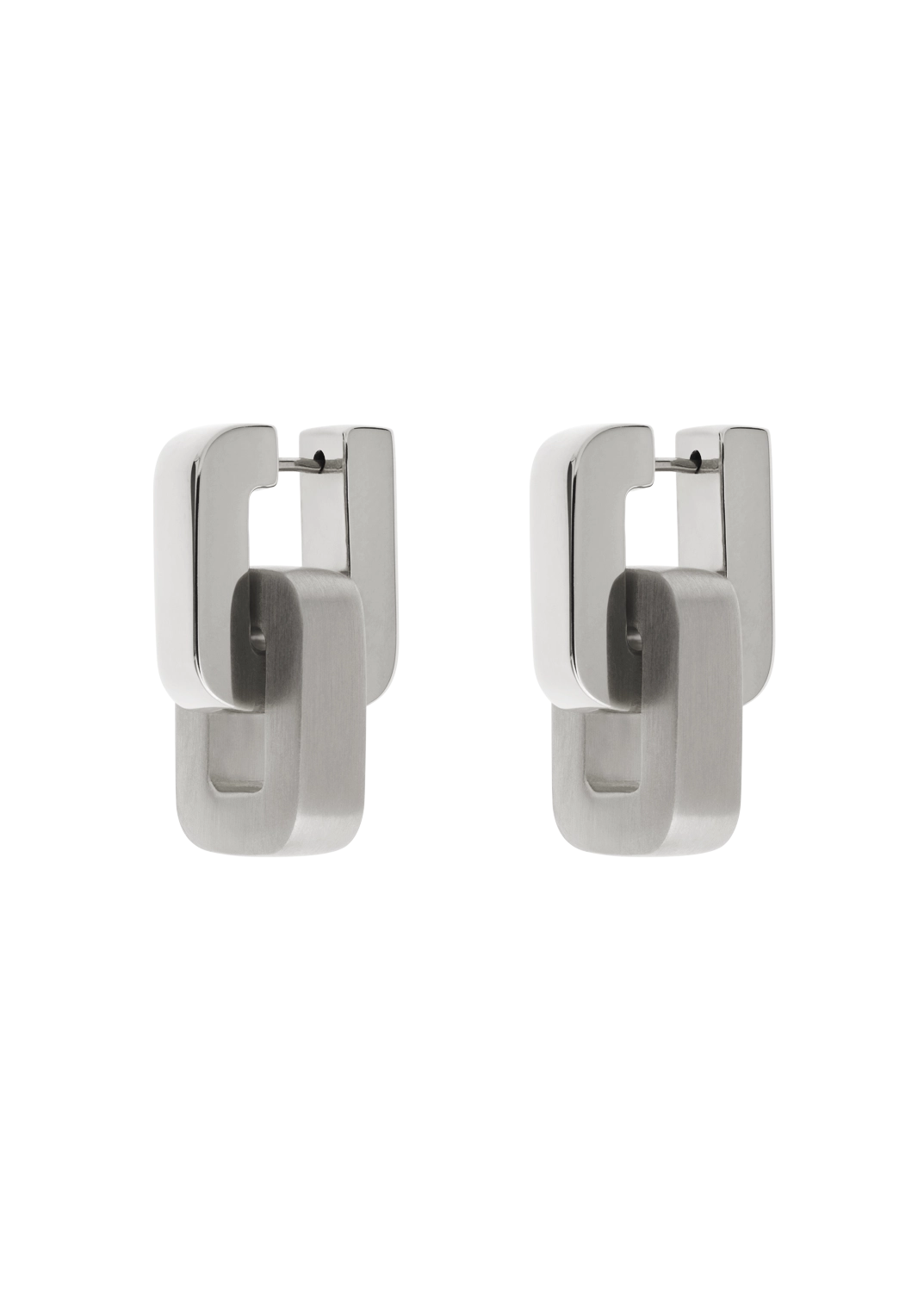 Cercei dubli Fiona — geometrie îndrăzneață, înmuiată de lumină. Realizați din argint sterling 925, finisați cu rodiu alb sau placare cu aur galben de 24k, acești cercei au un design cu două verigi care reinterpretează siluetele clasice ale lanțurilor în piese sculpturale de efect.